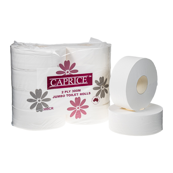 The Caprice Jumbo Toilet Paper Roll is 300 metres in length and is a comfortable, practical and simple hygiene solution for high-volume washrooms. The Jumbo Roll is two ply for comfort and long-lasting versatility.